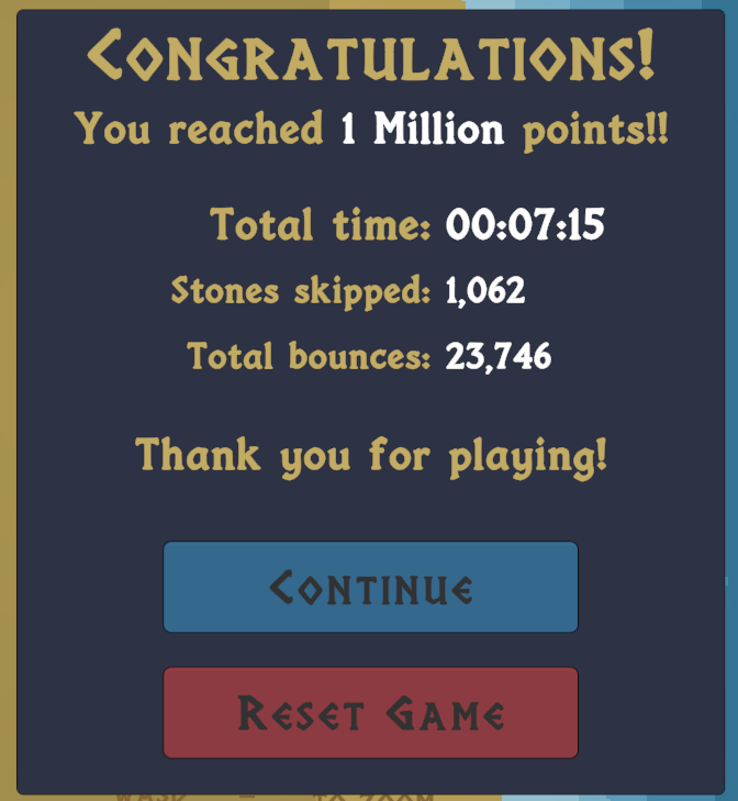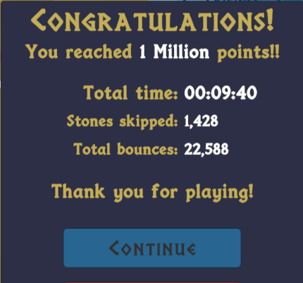 I reached 1 million points for 12:58. The game kinda fun and chill but for first minute I didnt understand what I needed to do cause the strength perk button has a very similar color to the water near by.